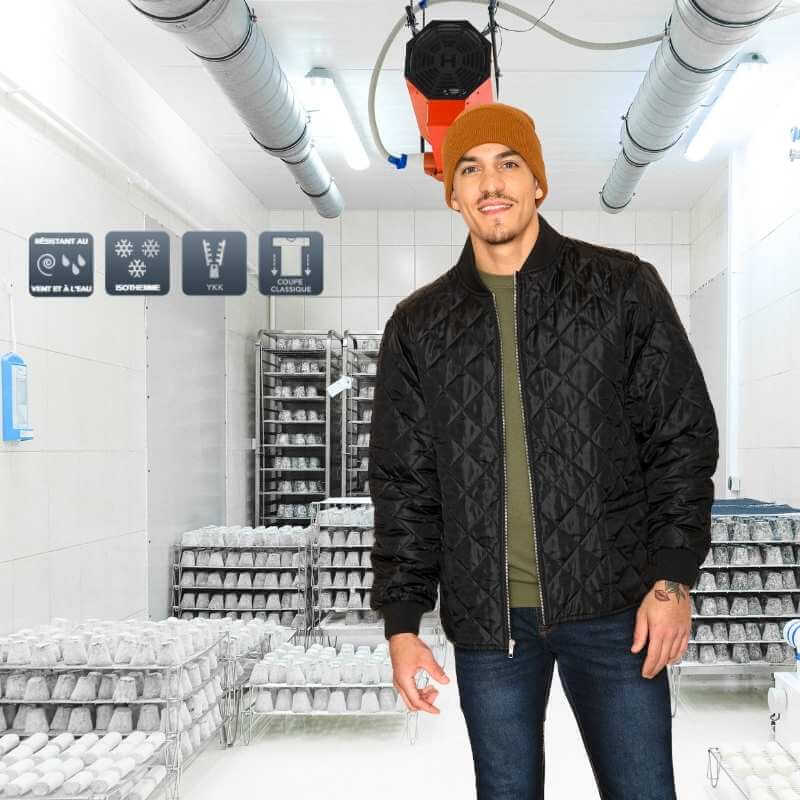 Le manteau noir Freezer Essential est un manteau isotherme unisexe conçu pour offrir une protection fiable contre le froid, le vent et l’humidité. Idéal pour les conditions hivernales du Québec et le domaine alimentaire, il combine une isolation matelassée en losanges avec un traitement hydrofuge sans PFAS pour un confort durable au travail.